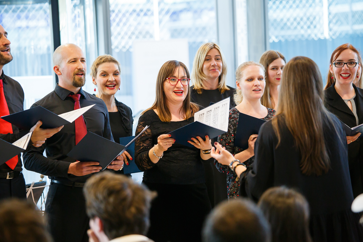 It all started with the musical sentiment of Remigiusz Wojciechowski from Bayer. Music has always been important to him. Once, sitting in the audience of the Philharmonic, he recalled the emotions that accompanied him when he sang in the choir. He thought he would like to have them in his life again. To do that, you needed people and a conductor. There was no shortage of people in the Bayer office, and a casting call for conductor was announced. It was won by Wiktoria Pagieła , a graduate of the Gdańsk Academy of Music, and so, in 2018, the Bayer employee choir was formed. Less than a year later, it transformed into the choir of the entire Olivia Centre. Of course, we can do more together. He was joined by singing employees, AirHelp, Energa, GFKM, Nordea, Olivia Centre, PwC, Sii, Talkers and Thyssenkrupp.