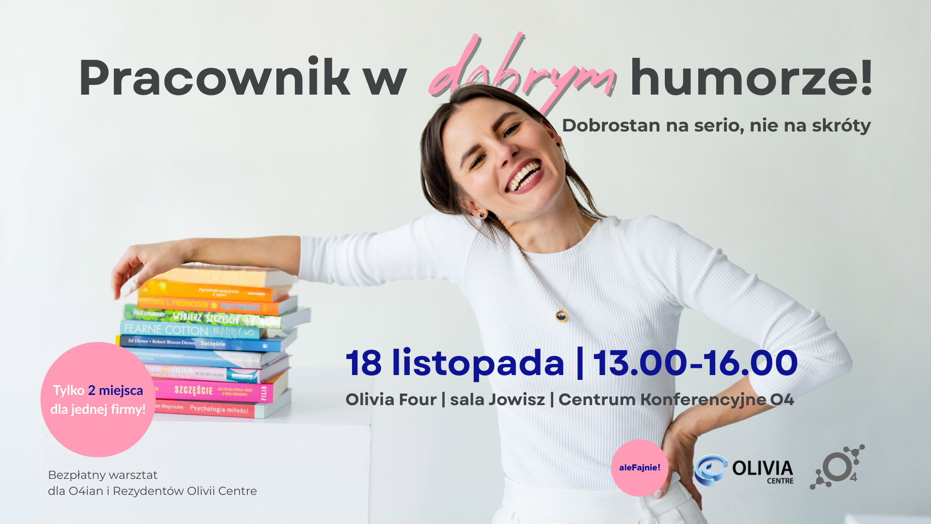 Zapraszamy na warsztaty aleFajnie! | Olivia Centre | O4 Coworking z Dominiką Harasim psycholożką i ekspertką psychologii pozytywnej.