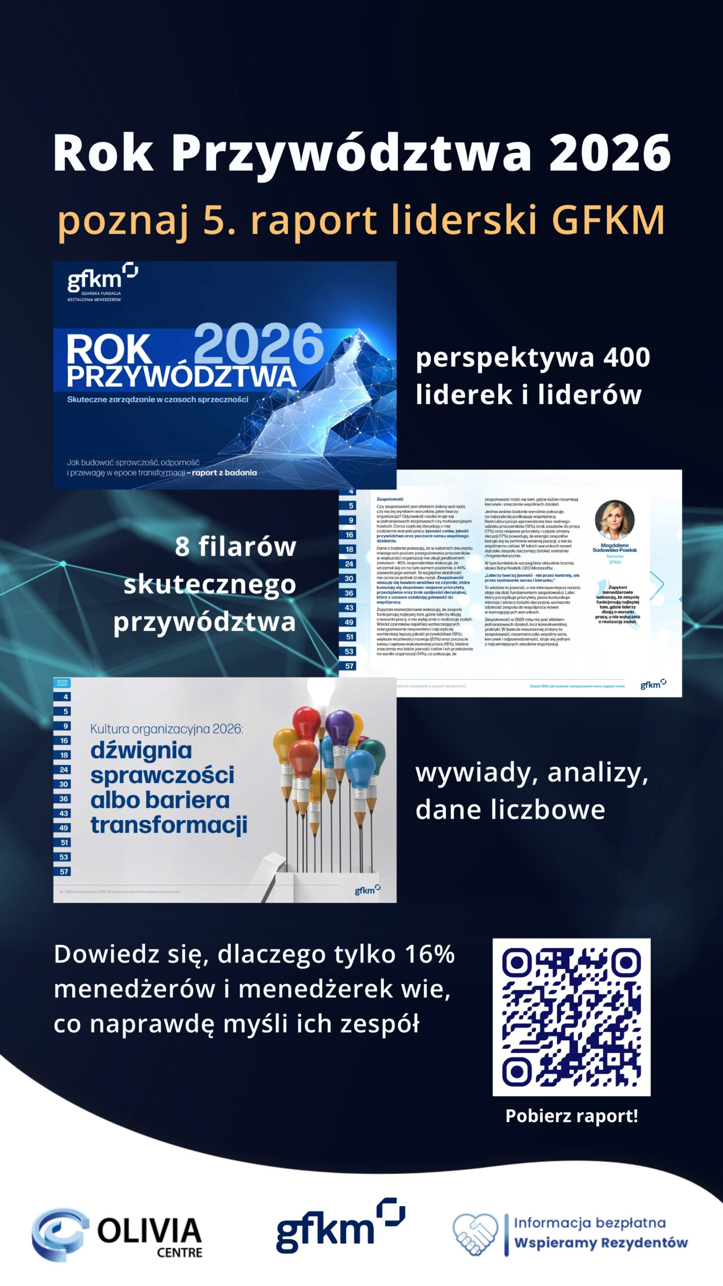 W świecie kumulujących się zmian transformacja przestaje być projektem. Staje się kompetencją – organizacyjną i liderską. Poznaj raport „Rok Przywództwa 2026”, przygotowany przez naszego rezydenta, GFKM (Gdańską Fundację Kształcenia Menedżerów). To już piąta edycja badania – wcześniej realizowanego pod nazwą „Rok Lidera” – które z roku na rok dostarcza pogłębionej diagnozy kondycji przywództwa w Polsce.