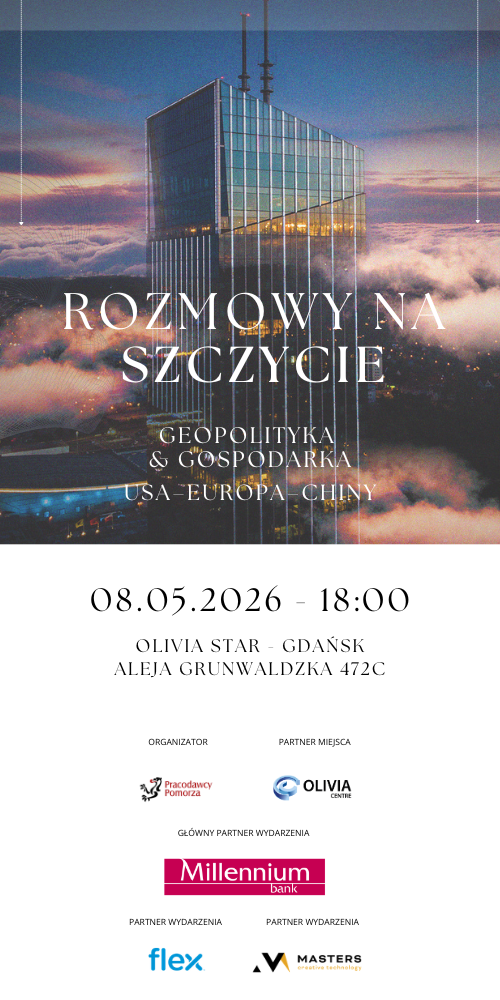 Pracodawcy Pomorza i Olivia Centre zapraszają na kolejną wyjątkową debatę w ramach cyklu „Rozmowy na szczycie”. Tym razem tematem przewodnim będzie geopolityka i gospodarka na linii USA–Europa–Chiny. Wydarzenie odbędzie się 8 maja 2026 roku o godz. 18:00 na 34 piętrze Olivii Star. Obowiązuj zapisy.