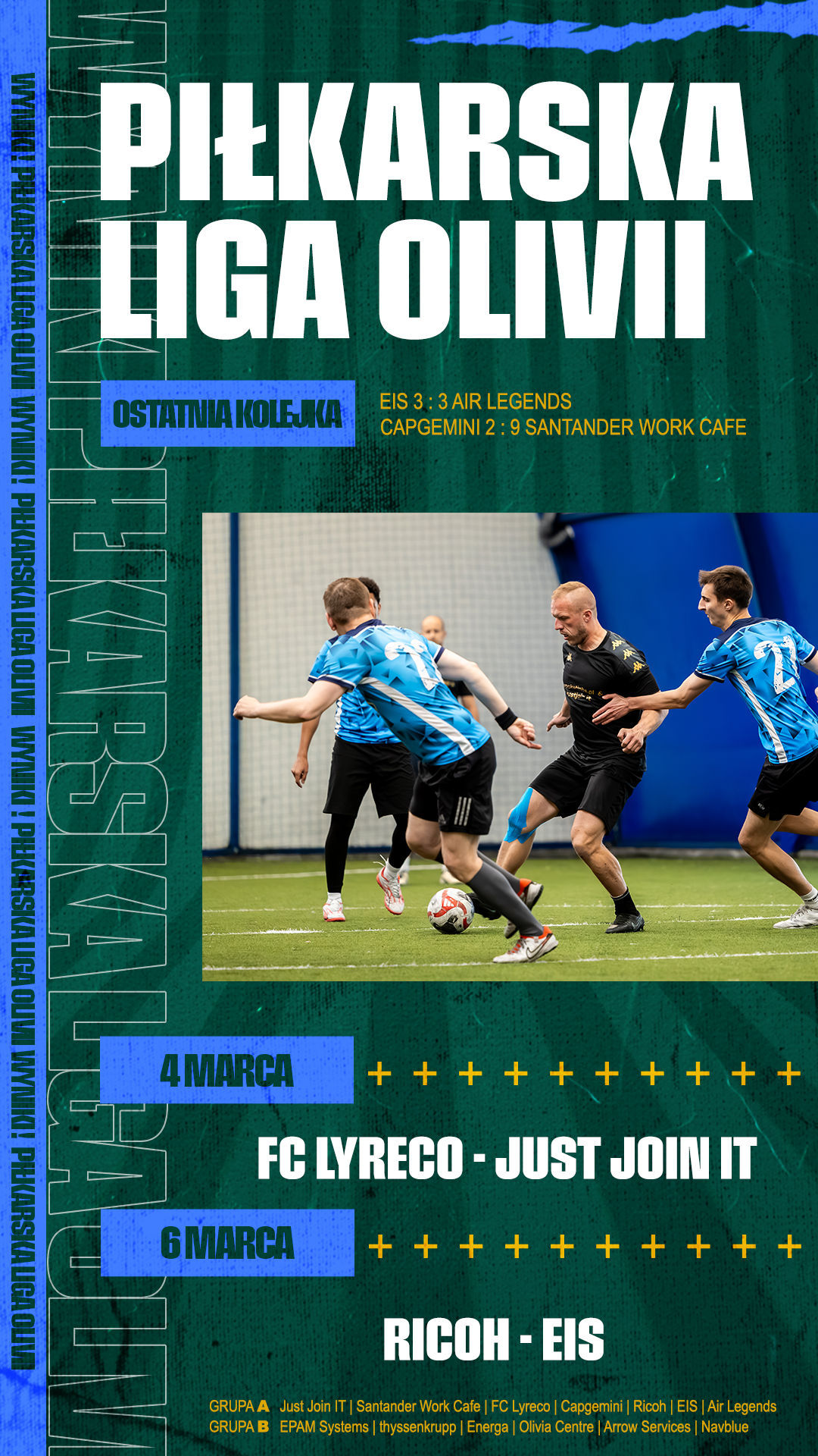 Czas start! Rozpoczęliśmy kolejny sezon Ligi Piłkarskiej Olivii, w której emocje, sportowa rywalizacja i dobra energia znów spotykają się na jednym boisku. W tym roku w rozgrywkach bierze udział jeszcze więcej drużyn – aż 13 zespołów podzielonych na dwie grupy. W sumie to ponad 200 zawodników reprezentujących firmy rezydujące w Olivia Centre. Wszystkie mecze, jak co roku, prowadzą profesjonalni sędziowie Pomorskiego Związku Piłki Nożnej, gwarantując najwyższy poziom rozgrywek i sportowego ducha.