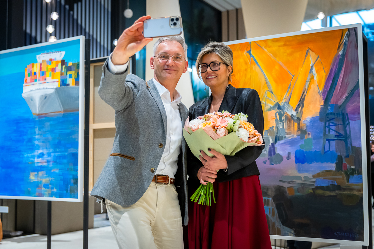 Obrazy „Kontenerowiec” oraz „Gdańsk – miasto żurawi” stanowią opowieść o gospodarczej i historycznej tożsamości Gdańska. Kontenerowiec – zbudowany z prostokątów barw jest symbolem globalnych przepływów, ruchu i zmian, które rozgrywają się tuż poza linią horyzontu. To świat transportu, handlu, ekologicznego niepokoju i międzynarodowych powiązań, przedstawiony w formie malarskiego dialogu pomiędzy rytmem kontenerów a spokojem morza.