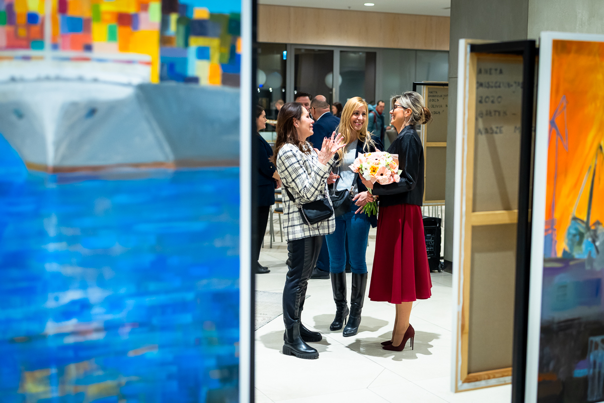 Wszystkie obrazy, od przeszklonych ścian Olivia Star, przez stoczniowe żurawie i kontenerowce, po plaże i kutry, układają się w jedną wspólną narrację: zapis tego, co znajduje się między człowiekiem a horyzontem. To malarska odpowiedź na doświadczenie patrzenia z wysokości, ale również patrzenia w głąb – w przeszłość miasta, w osobiste wspomnienia artystki, w rytmy codzienności, które z pozoru są zwyczajne, lecz oglądane z odpowiedniej perspektywy stają się znakiem miejsca i tożsamości.